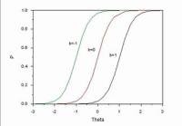 The model represents the item response function for the 1 – Parameter Logistic Model predicting the probability of a correct response given the respondent’s ability and difficulty of the item. In the 1-PL model, the discrimination parameter is fixed for all items, and accordingly all the Item Characteristic Curves corresponding to the different items in the measure are parallel along the ability scale. The figure shows 5 items, the one on the furthest right is the hardest and would be probably endorsed correctly by those with a higher ability.