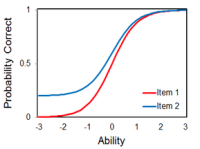 Guessing (ci) Item guessing is the third parameter that accounts for guessing on an item. It restricts the probability of endorsing the correct response as the ability approaches -∞.