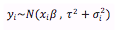 Where is the estimated effect size for the study population i, which has a normal distribution with mean representing the true effect size for such population, and is the within-study (i.e. sampling error) variance. In turn, is assumed to be a population-specific realization of the distribution of true effects for all effects, where its mean is parameterized as a function of some study-level variable(s) , and is the between-study (i.e. heterogeneity) variance. The combined two-level distribution is presented below [5]: