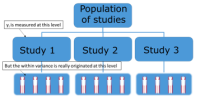 As can be appreciated from the model above, meta-regression can be regarded as a specific case of multilevel or mixed models. Other forms of integrative analytical techniques can also be fit into this framework. In this sense, random-effects meta-regression would be the most flexible of the integrative analytical techniques, because it allows simultaneously to estimate a random effect for differences between groups and allows to parameterize the expected value of the parameter of interest as a function of group-level variables (a fixed effect for differences between groups) θi=xiβ . As opposed to this, random-effects meta-analysis estimates a random effect between groups, but it summarizes the expected value for the parameter of interest as the study-specific value θi , thus, a larger proportion of the between study variance is forced into the random parameter (i.e. larger standard errors). Finally, fixed effects meta-analysis is the more restricted version of this family of models, since it doesn’t use random or fixed effects to explain variability across studies, only the within study error term εi. We already mentioned that a fixed effects meta-regression is rarely an appropriate model, but it would be equivalent to a scenario where all the variability between studies is assumed to be explained by the fixed parameter xiβ, and no room is left for additional random variation between groups. The following graph helps to illustrate the relationship between meta-analysis and multilevel models. Since typically researchers conducting meta-analysis and meta-regression don’t have individual-level data, this family of models can be regarded as an “incomplete” multilevel model. The within variance is originated at a level below individual studies, but it cannot be estimated from the available data. Therefore, it must be assumed to be known; this has gained this family of models the namesake of V-known models [6].