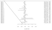 Funnel plots are equivalent to those used in meta-analysis. Forest plots instead may be slightly different, since they do not include an overall pooled estimate. Instead, they may include multiple study-level Bayesian credibility intervals centered on BLUPs. One peculiarity is that observed point estimates may lie outside the credible intervals due to Bayesian shrinkage. This occurs because the BLUP based intervals “pull” the observed values towards the linear prediction with a “force” inversely proportional to the credibility of the observed values (e.g., study No. 26 below).
