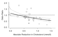In the graph above, the solid line represent linear predictions for the odds ratio as a function of the mean absolute reduction in cholesterol observed at the group level. Dot lines are 95% confidence bands. The bubbles are the observed log odds ratios for each study, with bubble sizes proportional to the study weights. The horizontal dashed line represents the null association scenario.