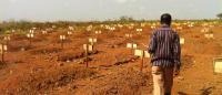 We have arrived at the Port Loko New Cemetery. Today it is rudaceous with 522 mounds and 10 or 20 open pits, deep rectangular graves. In front of many of the mounds sits a wooden post with a black crosspiece plank. Written black white paint:  A name or the title, unknown, and age or blank space, the name of the village where the expired person was found, and a site number.