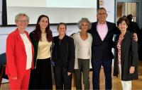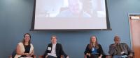 A cross-departmental panel discussion between five faculty members concluded the event launch. Left to right: Alejandra Paniagua-Avila, Kate Lavero, Claire Greene, Bob Fullilove, and Jeremy Kane on screen.