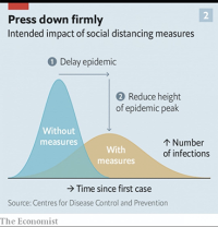 News stories and social media have popularized the notion with a chart showing two divergent curves of the outbreak’s progression—one a steep mountain in which new cases and fatalities happen quickly and in great numbers, the other a gentler hill where the number of new cases is spread out over a longer period of time. One popular version of the chart appeared in The Economist magazine; the chart’s title appeals for measures to “press down firmly.” A lighthearted take transforms the twin curves into feline shapes (its title: “catten the curve”).