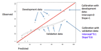 More important than this p-value, however, is the calibration plot that can be used to visualize what the Hosmer-Lemeshow test is testing. Calibration plots are often an excellent manner to evaluate the successes and/or failures of your predictions. Furthermore, a smoothed line can be fit over the plot, from which a calibration intercept and a calibration slope can be estimated. The intercept indicates the extent to which predictions are systematically too low or too high (“calibration-in-the-large”). Ideally, the slope should be close to 1. Although these conditions may be met in the development dataset, deviations in validation datasets are not uncommon, and are often attributable to the phenomenon of regression to the mean (Figure 2). Slopes less than 1 in validation set may indicate that the original model was overfitted and that there is a need for shrinkage of prediction model regression coefficients (3).