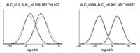 Figure 4. In these simulated examples, there is a minimal change in AUC, but NRI is relatively high (0.622). This is explained as the occurrence of many individual changes in risk values but no substantial change in distribution of predicted risks on the population level. (Figure from Kerr et al, 2014).