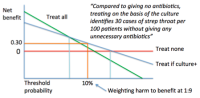 Figure 7. Basic example. For sore throat (disease), should you use a throat culture to determine whether to treat with antibiotics (decision)? If you weigh the harm of overtreatment with antibiotics against the benefit of appropriate treatment with antibiotics at 1:9 (threshold probability = 10%), then using this decision rule identifies 30 true positives per 100 patients without any overtreatment (net benefit).